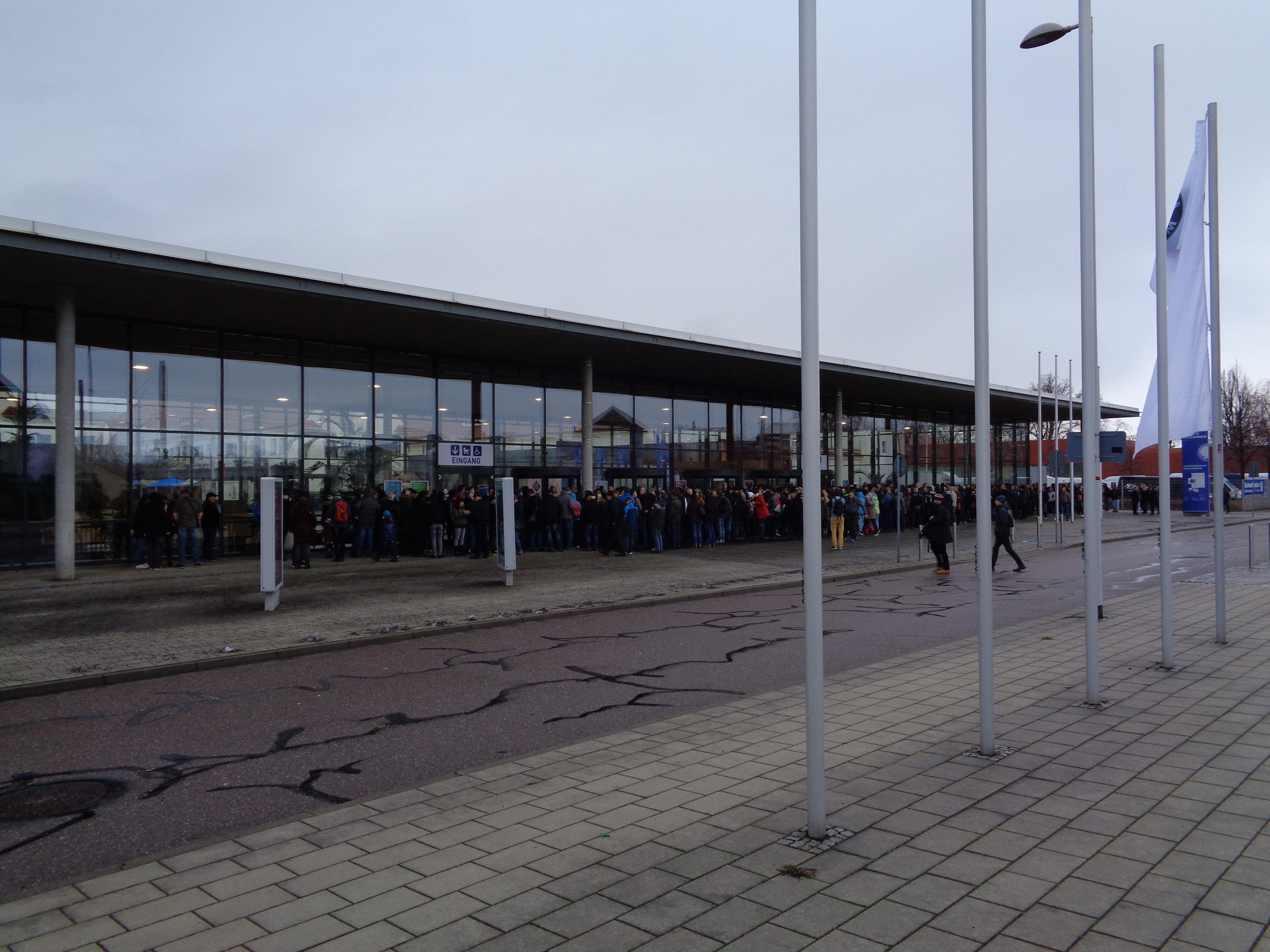 Ich für mich, war so aufgeregt, habe Stunden vorher mit der Vorbereitung begonnen. Der Blick aus dem Fenster zeigte, nicht schön Nieselregen, grau bei 6°C, also perfekt für einen Messebesuch. Mit Bus und Bahn zur Messe Dresden gefahren und der erste Blick. Tausend Menschen, die alle nicht die Sächsische Zeitung gelesen haben, denn diese Zeitung hat den Beginn der Messe mit 11 Uhr angegeben. Zwei Vertreter der Rollerfreunde standen etwas abseits, mag sein weil Rollerfahrer eh immer anders sind. Frank und Alexander standen da und warteten. In den Schlangen an der Kasse ist uns Rolf noch zugelaufen und so war die Gruppe komplett, vollzählig und bester Laune und Erwartungen. Jeder hat 6 € Eintritt bezahlt. Normal war irgendwie 8 €, aber die hat anscheinend niemand bezahlt, weil jeder irgendwie eine Ausnahme war. Frank bekam von irgendwem ein Gutschein zugesteckt, danke dem unbekannten Spender, um auch die 2 € zu sparen. Naja nach meiner Meinung, mehr wie 6 € war es nicht wert.