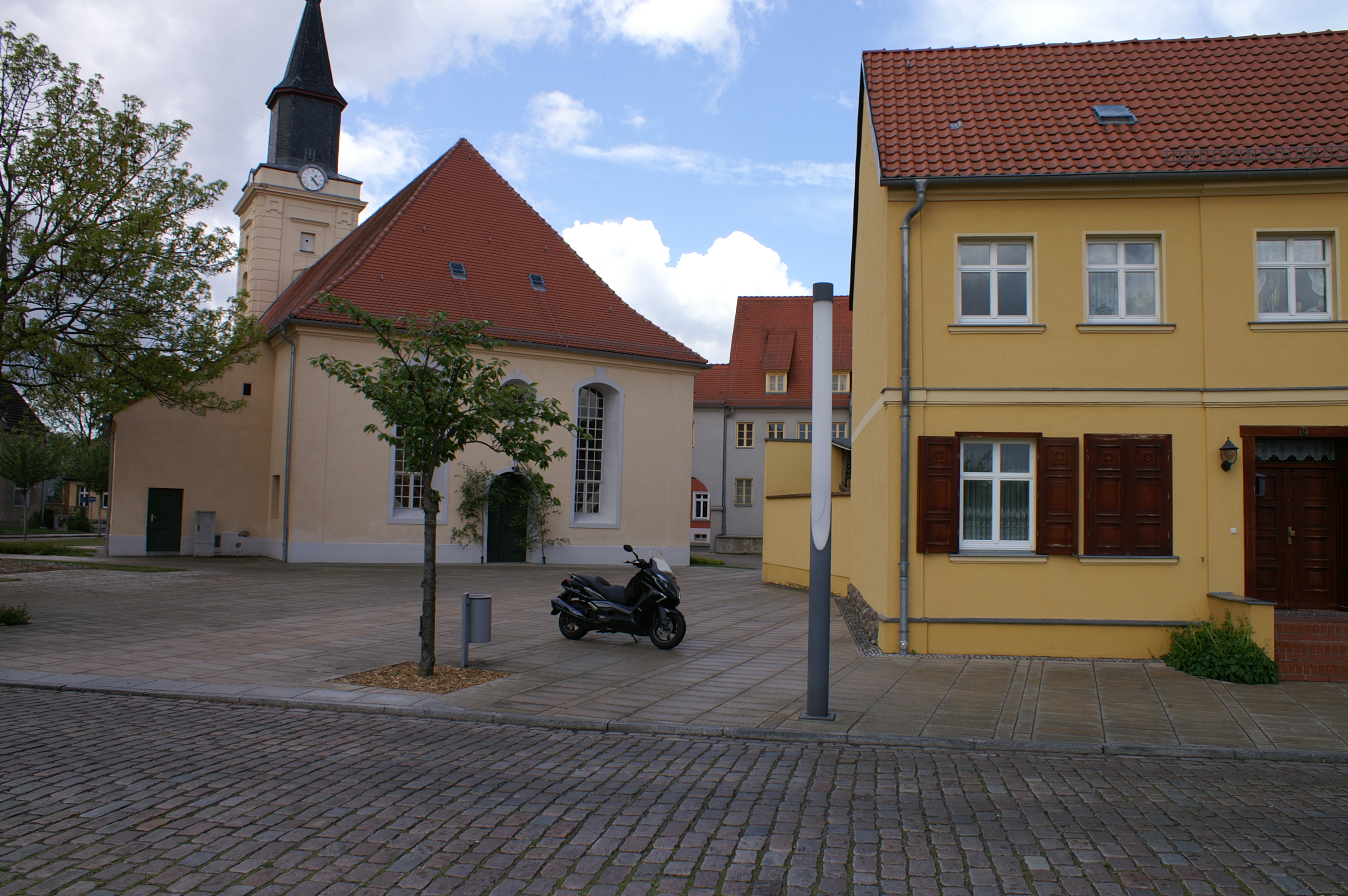Somit habe ich mir sehr viel Zeit genommen für die 178 km bis zum Zeltplatz habe ich 5:30 Stunden benötigt. Aber ich habe mir viel angeschaut, wie hier Weingut Proschwitz, oder Kirchen. Ich bin nach Karte und Kompass, ohne Navigationssystem gefahren, habe Bundesstraßen vermieden. Das hatte auch den Sinn, über die kleineren Straßen fährt man nicht so schnell, so etwa 60-80 km/h und es ist erstaunlich wie kalt 12-15°C sein können.
