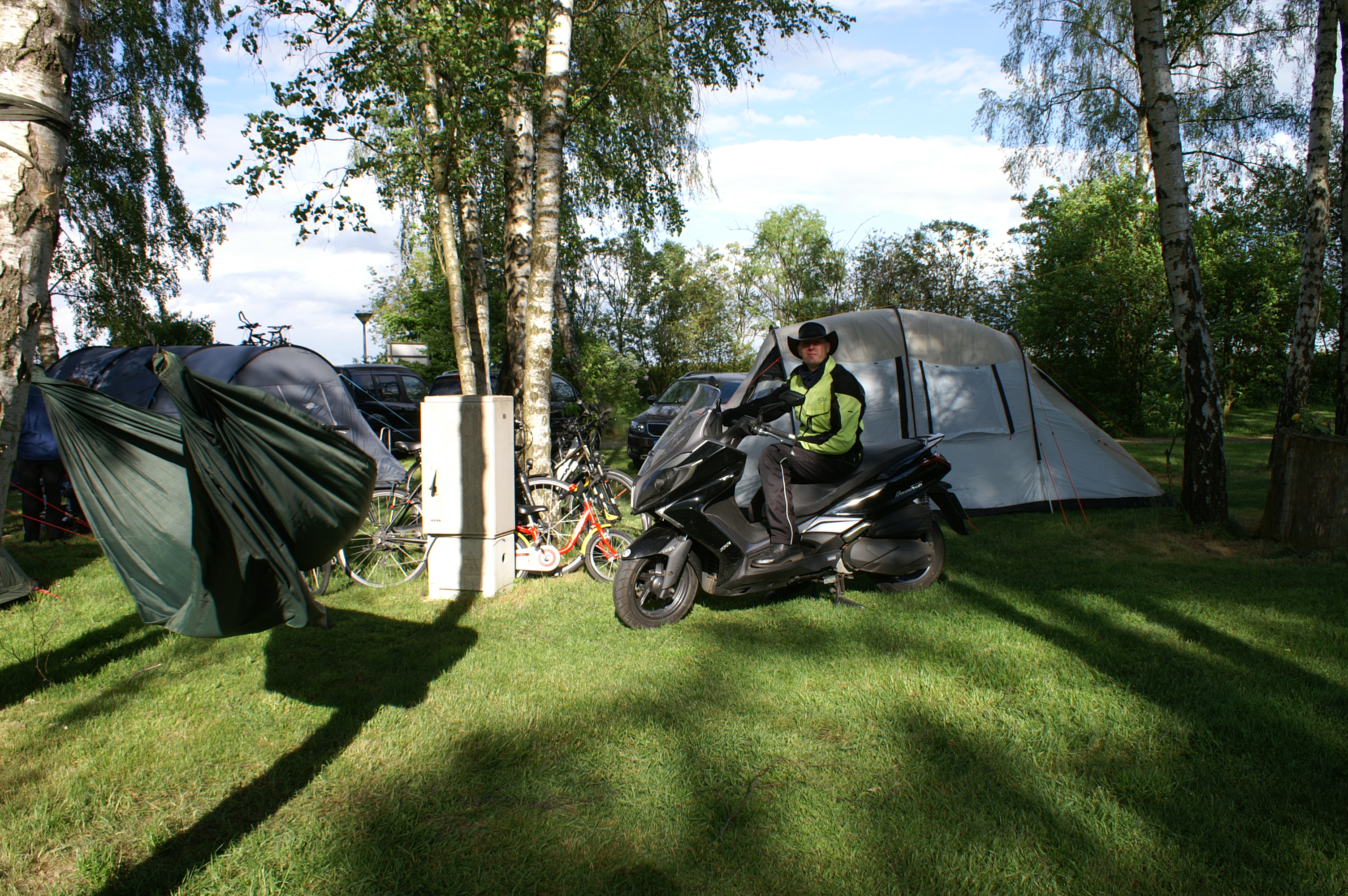 Am Zeltplatz wartet dann schon die Familie und die anderen befreundeten Familien. Acht waren angemeldet, aber 3 davon glaubten an den Wetterbericht und haben abgesagt. Der harte Kern sind eher Sportskanonen, ganzen Tag Rad fahren und skaten, bei denen man sich fragt wofür wurden eigentlich Roller geschaffen.